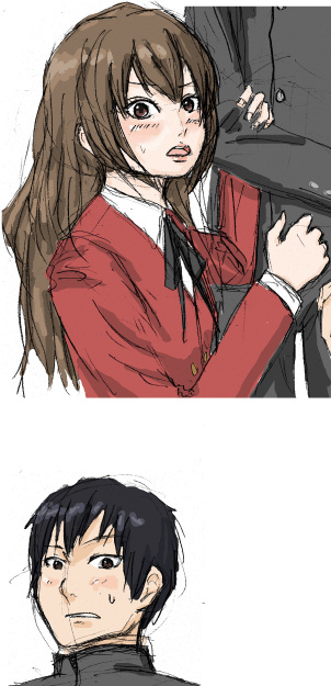 竜児の顔を凶悪にするのが難しいんです。人殺しの目ってどんな? アニメ寄りにすればいいんだろうか。それが一番堅実なのかもしれんですね。絵にしちゃうと黒目が小さいだけじゃあんまり怖い顔にならないですが。